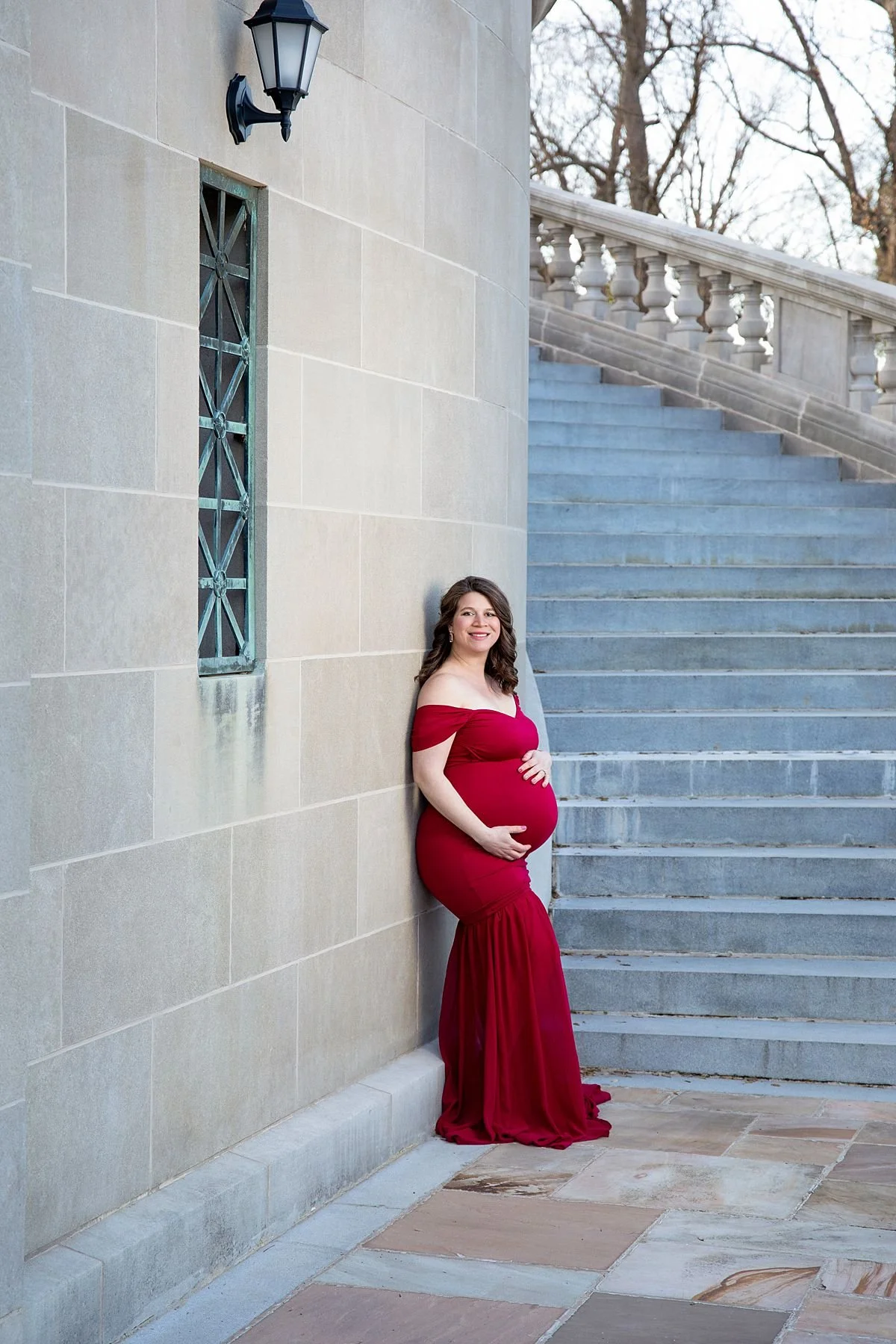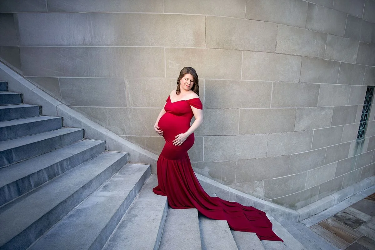 When this mama to be arrived in her stunning crimson off the shoulder gown, we knew the evening was going to be something special. We spent golden hour moving between two of Richmond’s most beautiful backdrops — the grand stone steps and sweeping architecture of The Carillon in Byrd Park and the beautiful tree lined paths nearby — and the results speak for themselves.