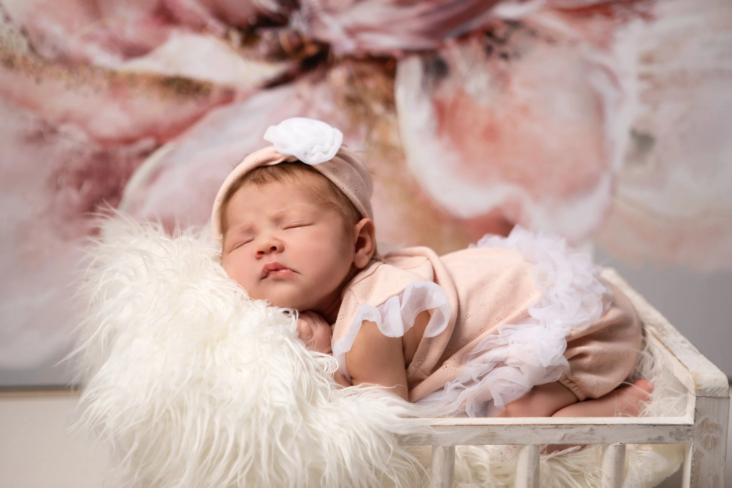 For this session, we chose a soft blush and cream color palette to complement baby’s delicate features and create a gentle, dreamy atmosphere. The floral backdrop added such a lovely touch and added just the right amount of softness without overwhelming the simplicity of the moment.