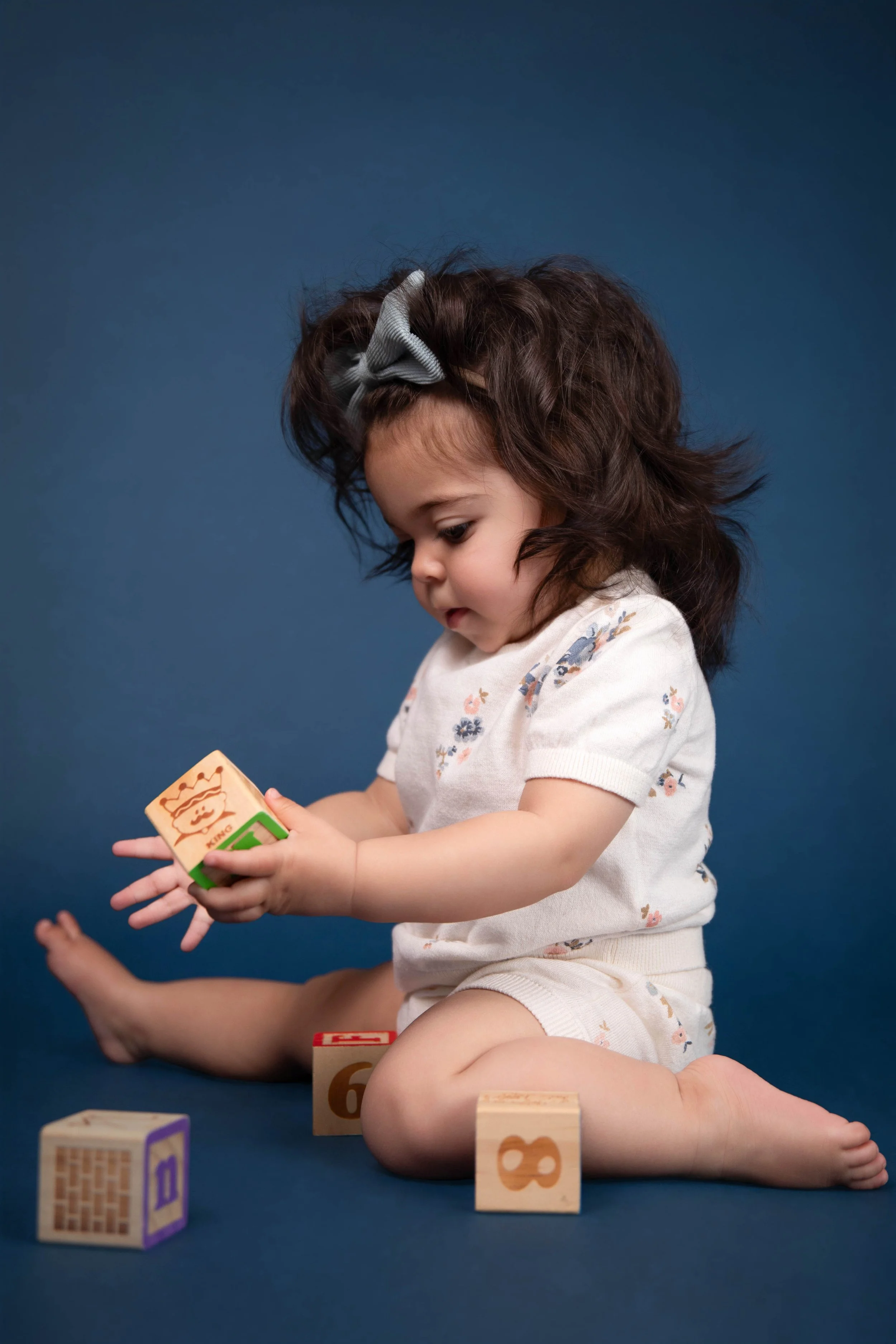 For this shoot, we kept things playful and sweet. Blocks, cake, and a colorful tutu brought the fun, but it was her personality that truly stole the show. Her crazy hair bounced with every giggle and grab, adding so much character and charm to every photo. It was impossible not to smile behind the camera.